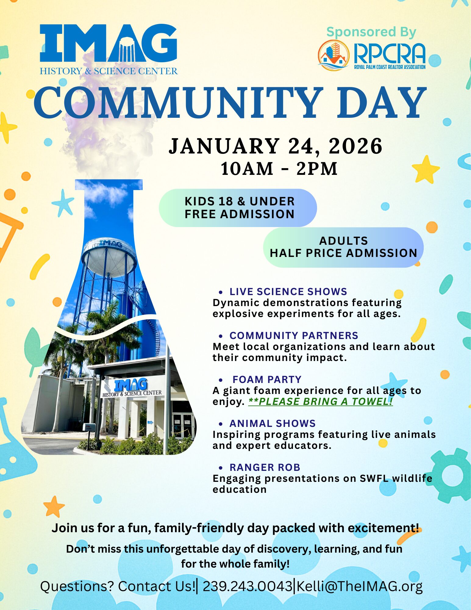 [Fort Myers, FL – January 13, 2026] The IMAG History & Science Center is holding an IMAG Community Day on Saturday, January 24, 2026, from 10 AM to 5 PM sponsored by Royal Palm Coast Realtor Association. Kids 18 years old and under are free and adults are half-off admission. Prior to the event, tickets must be purchased or reserved online at theIMAG.org. Adding to the excitement and fun of Community Day, the IMAG is planning different activities and crafts for children and families as well as animal shows, science shows, and more. In addition, special organizations from the community are joining in on the fun including Lee County Sheriff’s Department, the Fort Myers Fire Department, and Lee County Mosquito Control District… it just wouldn’t be Community Day without our Fight-the-Bite friends.